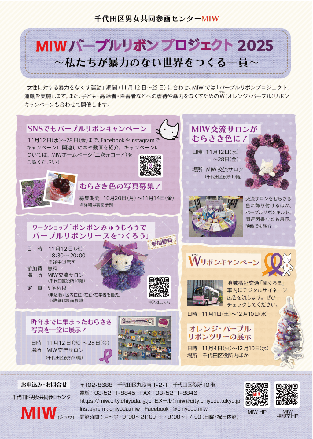 男女共同参画センターMIWでは、「女性に対する暴力をなくす運動」期間に合わせ「パープルリボンプロジェクト」に取り組んでいます。