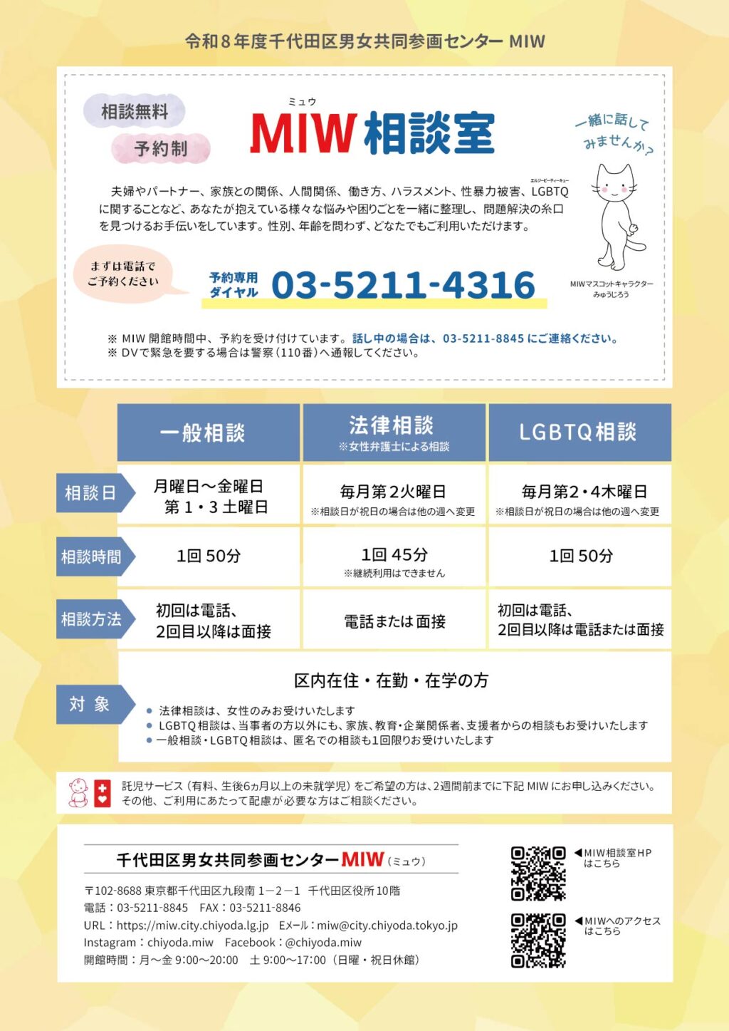 - 対象:千代田区在住・在勤・在学の方。性別や年齢を問わず相談できます。